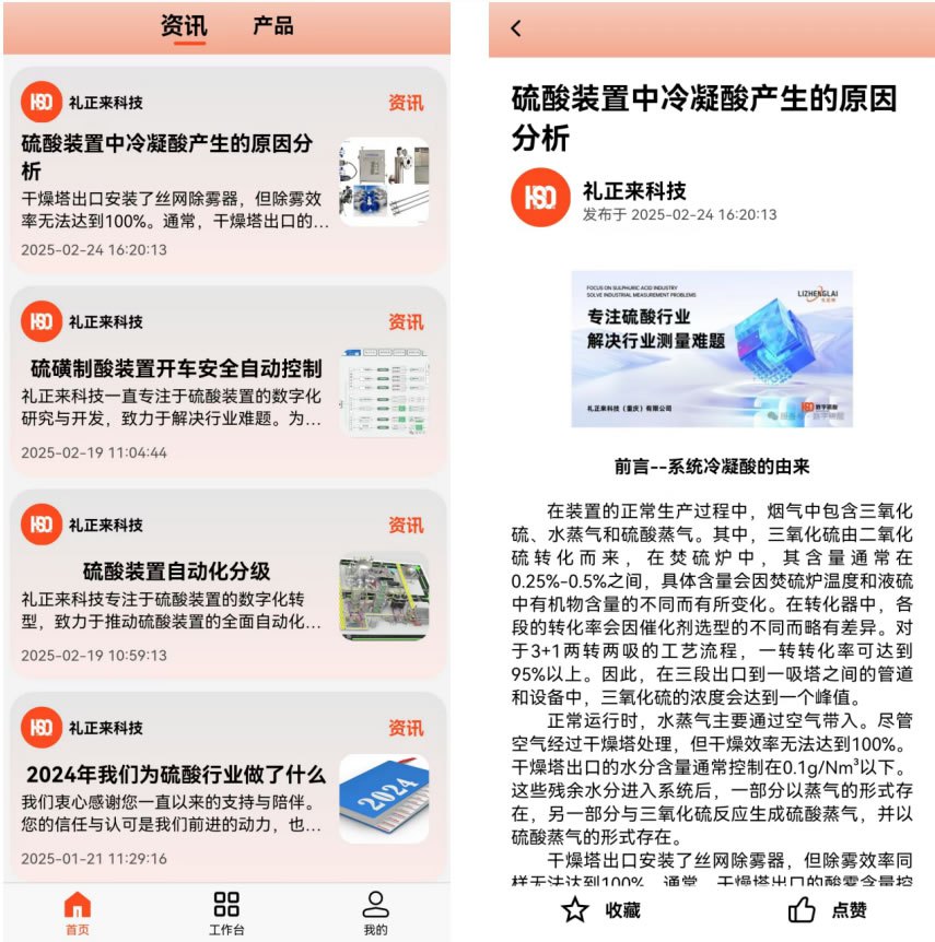 在每周特定時間段內,我們會實時更新資訊內容,給用戶分享硫酸行業中的最新狀況消息,例如,國內硫酸價格漲幅,原料硫黃價格漲幅狀況;下游磷肥進入淡季,鈦白粉、己內酰胺等現狀和需求表現。除此之外,資訊功能還會展示硫磺制酸在生產過程中的出現的故障問題,例如,“硫酸裝置主風機喘振的原因分析”,“硫磺噴槍膨脹節損壞的原因分析”,“硫磺制酸余熱鍋爐火管泄漏原因分析”,“硫磺制酸系統升華硫產生的原因分析”等。