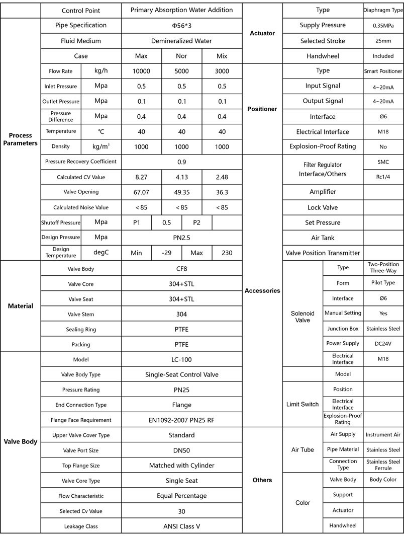 Valve Selection Parameter Table