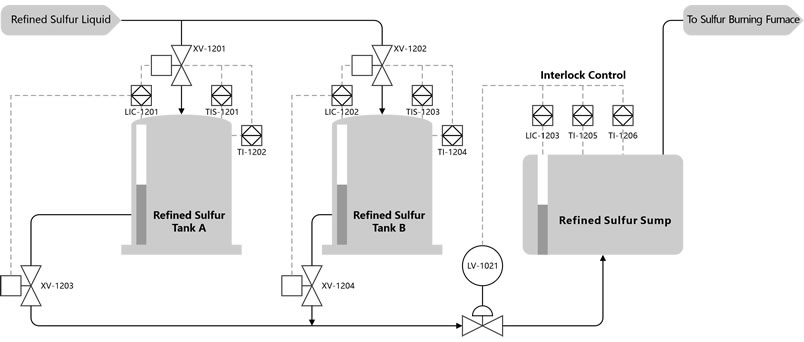 ● Two large tanks of refined sulfur are used alternately during the production process, and the time difference between alternating use is used to precipitate the ash in liquid sulfur. The liquid level of the two tanks is kept within the range of 70% of the liquid level change, so the automatic control of the liquid level is the key to ensure that the large tank is neither overflow nor empty, so as to meet the requirements of automatic control. Therefore, tank pouring control is the core of automatic control of large tanks.
