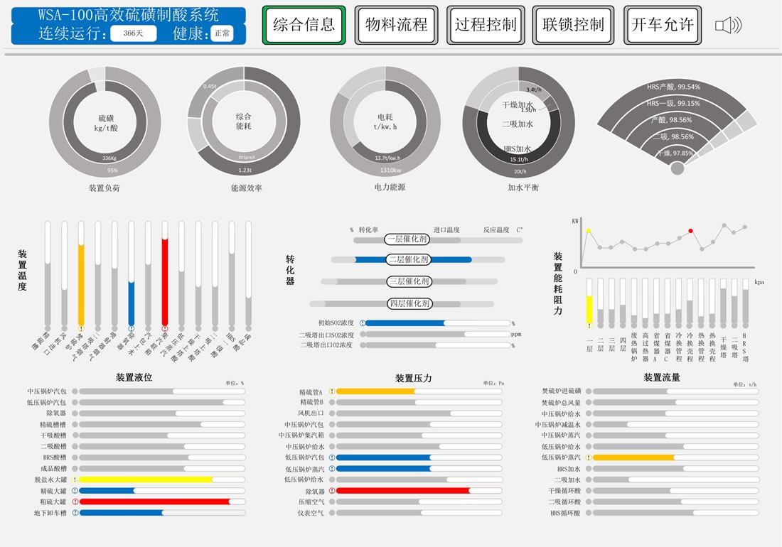 硫酸裝置由一張綜觀畫面顯示,可以通過綜觀畫面全面了解到硫酸裝置的健康狀態,綜觀畫面信息由KPI數據組成。為了體現綜觀畫面簡潔明了,綜觀畫面采用儀表面板風格,對不同類型數據進行區分,使操作員一目了然不用在大腦里轉換。
