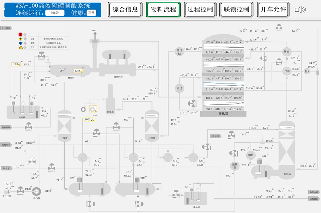 數字硫酸 DCS系統的設計原則是遵循人機友好,規避人們記憶限制,符合思考邏輯的思維設計。數字硫酸DCS系統應用了三層結構技術自動發現問題、協助分析問題、快速處理問題。實現裝置自動運行,本著裝置在故障初發期協助操作員快速調整運行參數。數字硫酸DCS系統應用了勢態感知技術、操作規程電子化技術、操作防錯技術。用勢態感知技術協助操作人員思考,電子操作規程防止誤操作,防止安全事故發生。綜合提高硫酸裝置經濟效率。