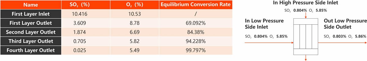 Timely understanding of the operation of the heat exchange equipment is essential to maintain the efficient conversion of the system. By comparing the concentration difference of SO2 and O2 at the inlet and outlet of the low pressure side of the heat exchange equipment, we can determine whether the equipment has leakage problems.