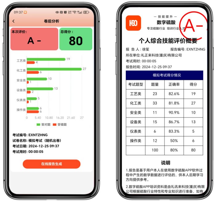 在模擬考試過程中,我們采用系統隨機抽取試卷的方式,將測試題目類型劃分為單選題、多選題、判斷題和填空題。考生需在規定的時間內完成所有題目,并提交試卷以計算總分。點擊“在線報告生成”按鈕后,即可生成“個人綜合技能成績表”。