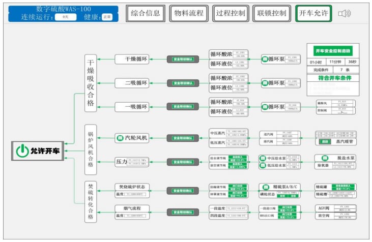 硫酸裝置的開車過程復(fù)雜且漫長,伴隨諸多安全風(fēng)險(xiǎn),涉及多個工藝段的相互耦合和化學(xué)反應(yīng)。傳統(tǒng)硫酸裝置的開車依賴于多工段人員的協(xié)作,但因協(xié)調(diào)不暢,常導(dǎo)致安全事故。為降低硫酸行業(yè)在開車過程中的安全風(fēng)險(xiǎn),并實(shí)現(xiàn)裝置的自動化運(yùn)行,禮正來科技根據(jù)不同硫酸工藝,自主研發(fā)了“一鍵開車”功能。該功能涵蓋以下關(guān)鍵環(huán)節(jié):開車前的安全檢查、工藝參數(shù)的自動調(diào)整與確認(rèn)、開車過程中工藝參數(shù)的自動調(diào)節(jié)、安全控制措施的實(shí)施,以及通過物料平衡的自動比對完成整個開車過程。