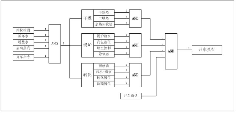 只有在這些環節都得到妥善處理后,才能開啟風機并開始噴硫磺。在啟動過程中,裝置的工藝流程從靜態狀態轉變為動態,工藝參數可能會發生劇烈波動。若裝置準備不足,極易引發事故。因此,對啟動過程進行嚴格的安全控制至關重要。基于啟動過程中可能出現的變化,設計一套完善且合理的控制邏輯顯得尤為關鍵。關于開車安全自動控制邏輯的詳細信息,請參見圖1。