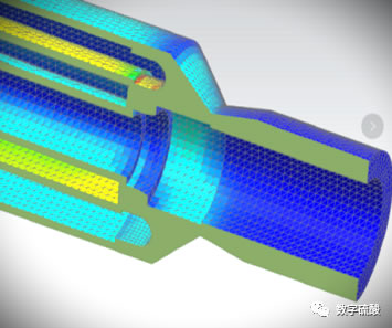 噴咀采用螺紋線密封,實現了800 ℃高溫冷熱激不會有液體硫黃泄漏。為減少槍身在焚硫爐內出現焊縫泄漏的幾率,通過巧妙設計使槍身在焚硫爐內只有一道焊縫,通過應力消除設計,可有效避免該道焊縫因應力集中而撕裂。對噴咀的蒸汽保溫夾套管焊縫進行有限元應力分析可見,蒸汽保溫夾套管焊縫處應力非常低